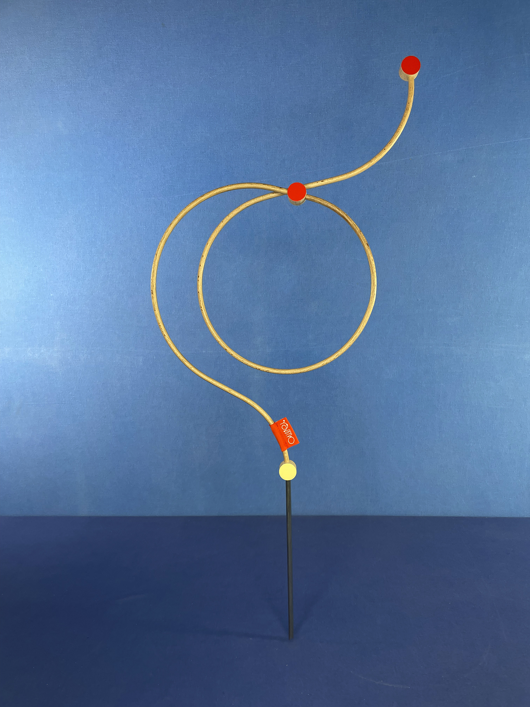 Les connecteurs : Il s’agit des pièces qui relient les tiges. Tout comme ces dernières, ils ont été fabriqués par mes soins (découpés, percés, poncés, vernis et peints), ce qui leur donne quelques irrégularités. Chaque face présente une couleur différente : vermillon et crème.