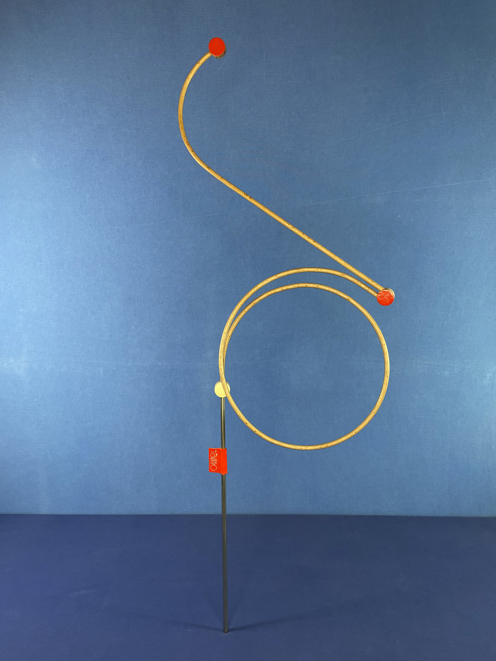 Les connecteurs : Il s’agit des pièces qui relient les tiges. Tout comme ces dernières, ils ont été fabriqués par mes soins (découpés, percés, poncés, vernis et peints), ce qui leur donne quelques irrégularités. Chaque face présente une couleur différente : vermillon et crème.