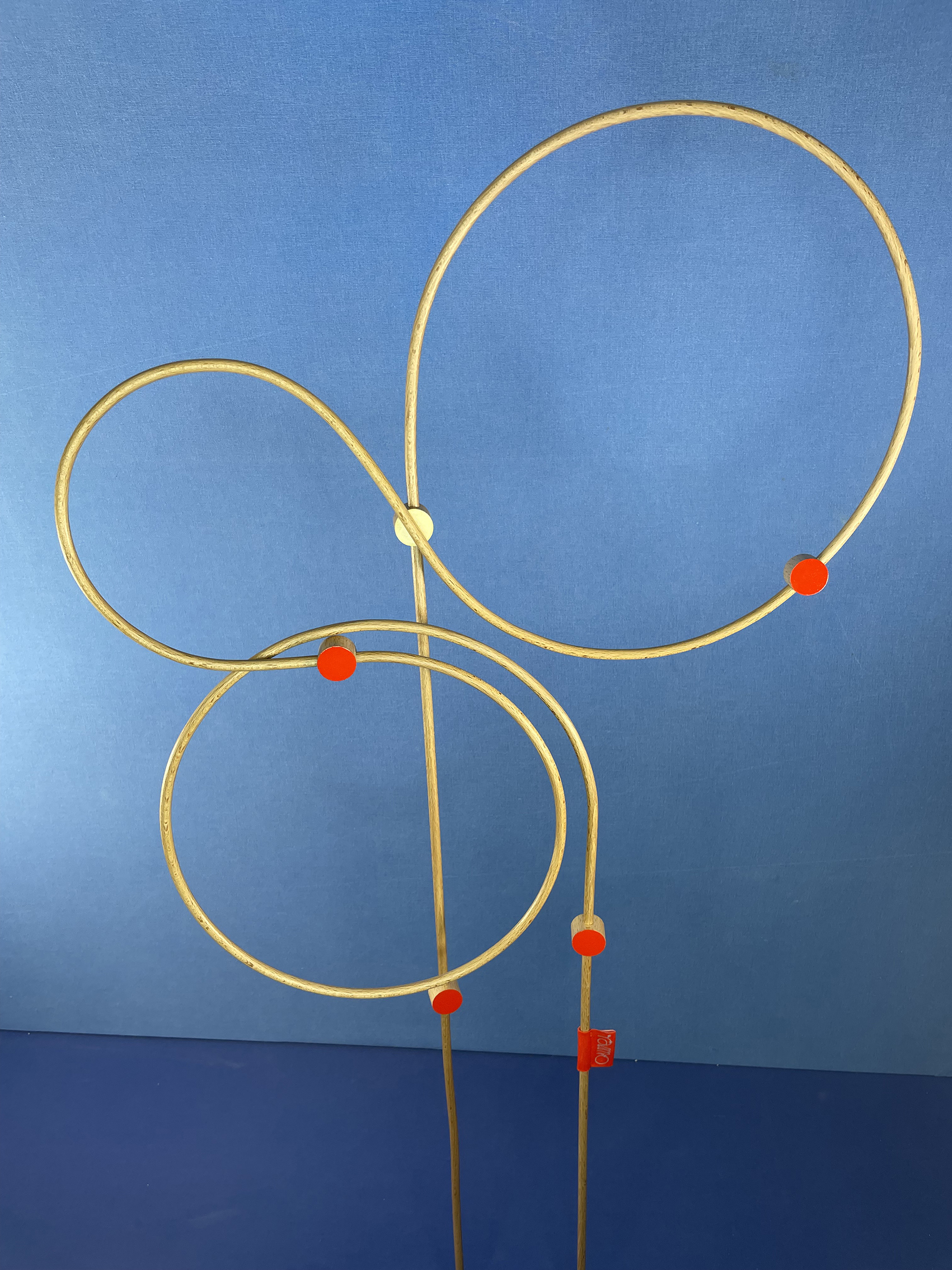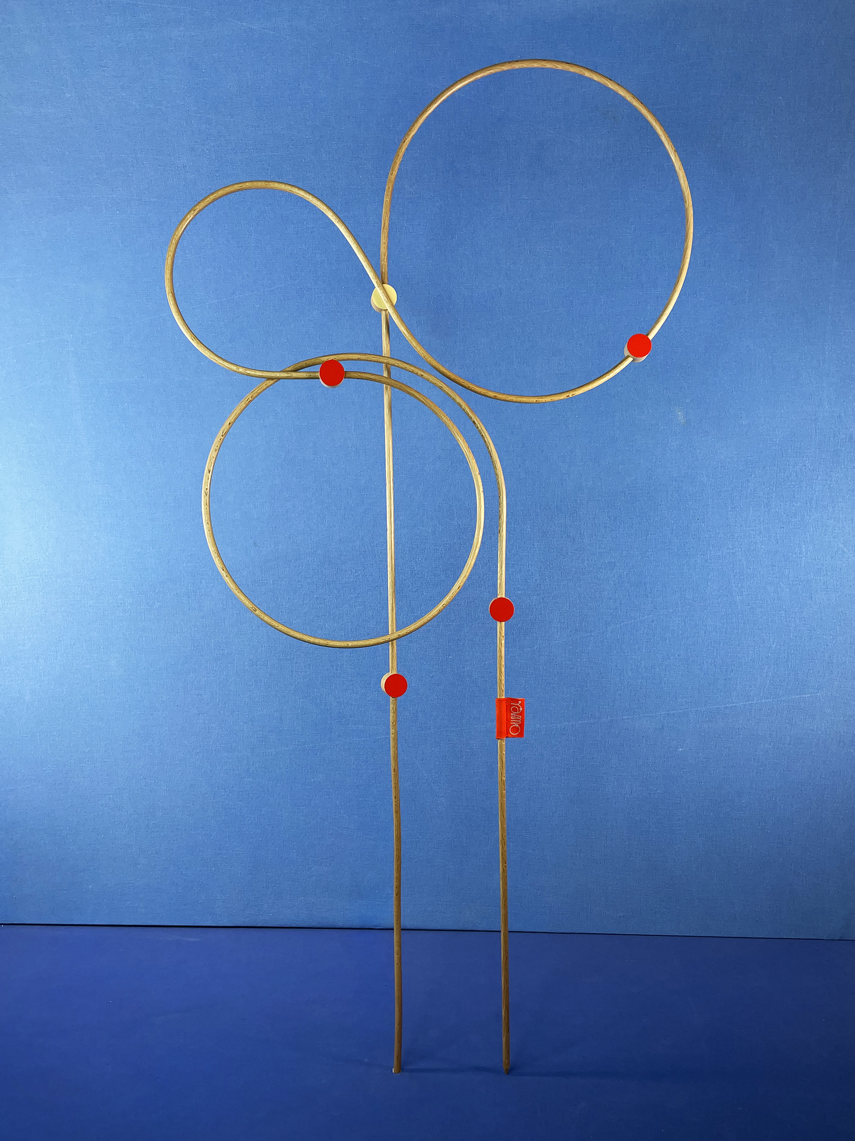 Les connecteurs : Il s’agit des pièces qui relient les tiges. Tout comme ces dernières, ils ont été fabriqués par mes soins (découpés, percés, poncés, vernis et peints), ce qui leur donne quelques irrégularités. Chaque face présente une couleur différente : vermillon et crème.