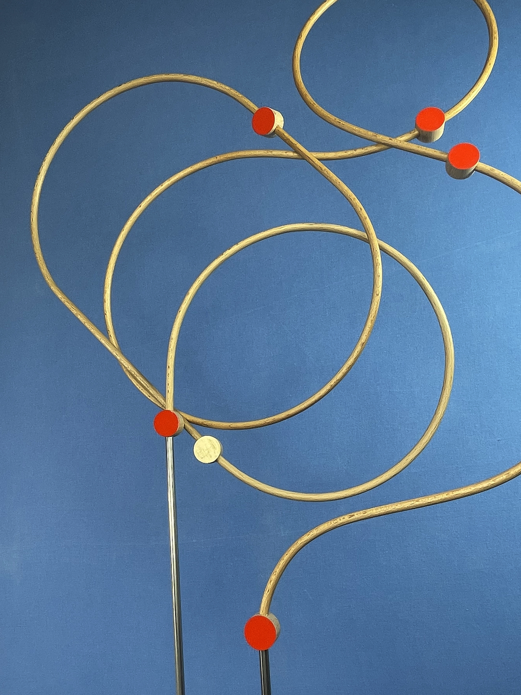 Les connecteurs : Il s’agit des pièces qui relient les tiges. Tout comme ces dernières, ils ont été fabriqués par mes soins (découpés, percés, poncés, vernis et peints), ce qui leur donne quelques irrégularités. Chaque face présente une couleur différente : vermillon et crème.