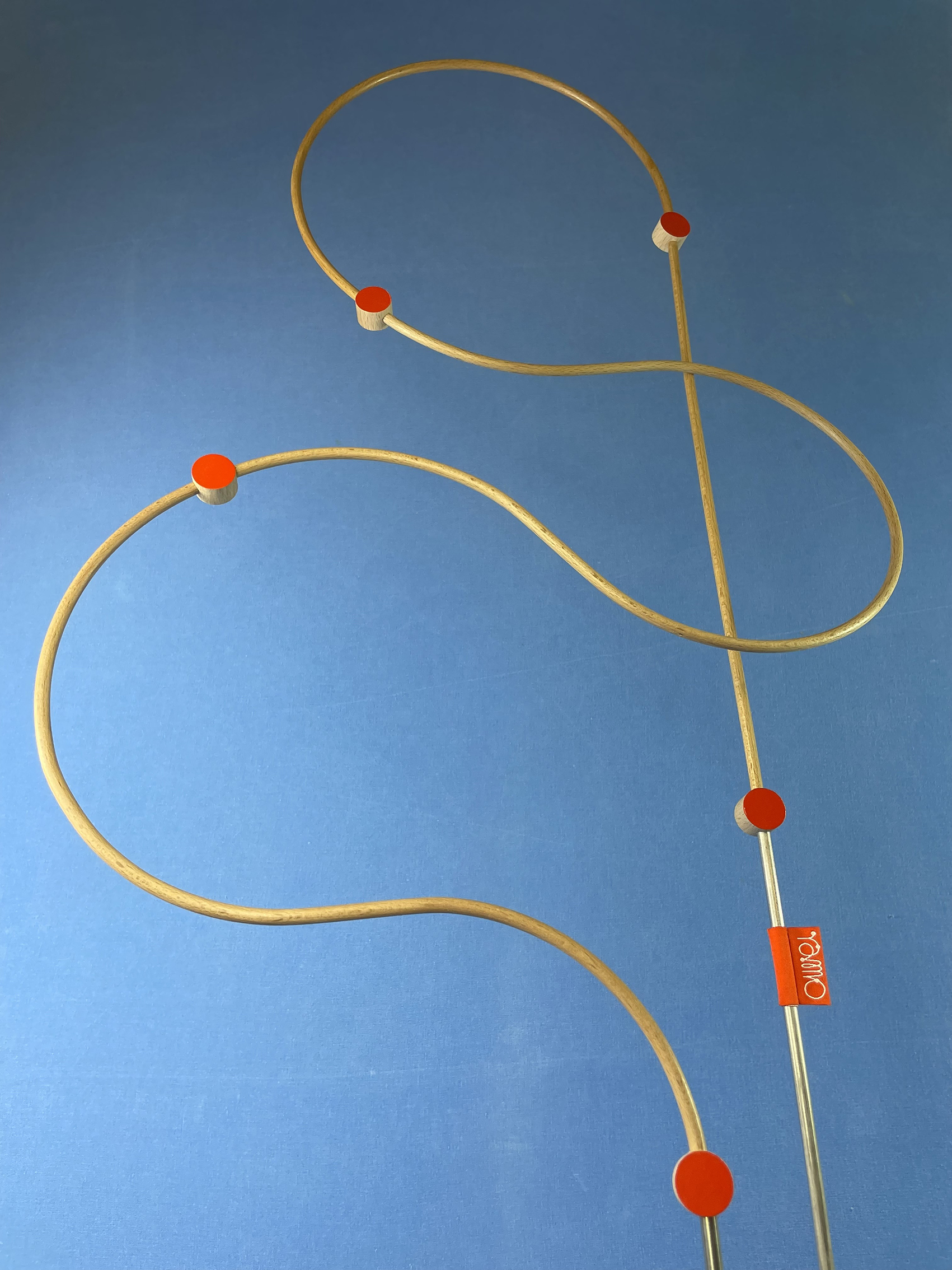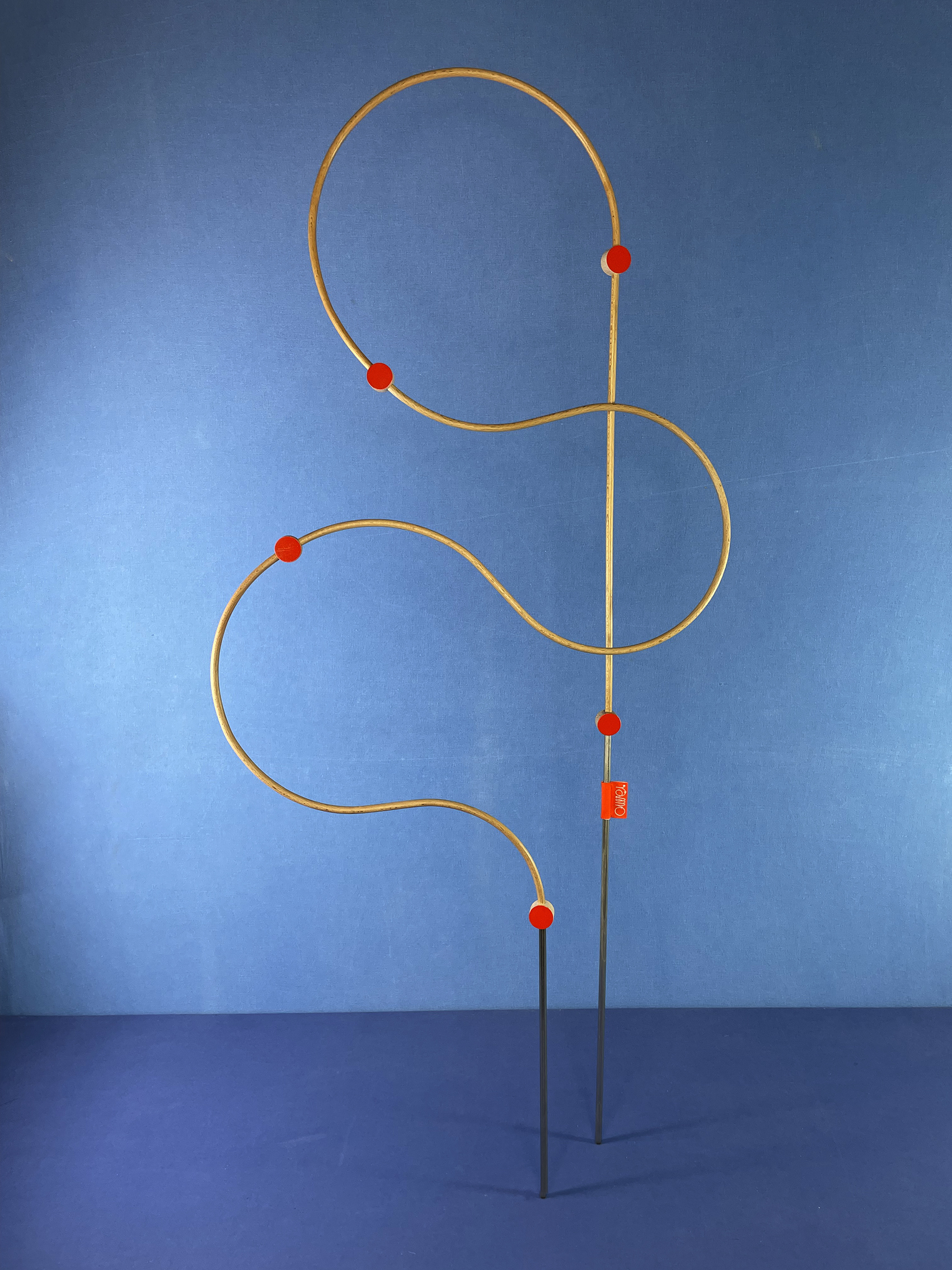 Les connecteurs : Il s’agit des pièces qui relient les tiges. Tout comme ces dernières, ils ont été fabriqués par mes soins (découpés, percés, poncés, vernis et peints), ce qui leur donne quelques irrégularités. Chaque face présente une couleur différente : vermillon et crème.
