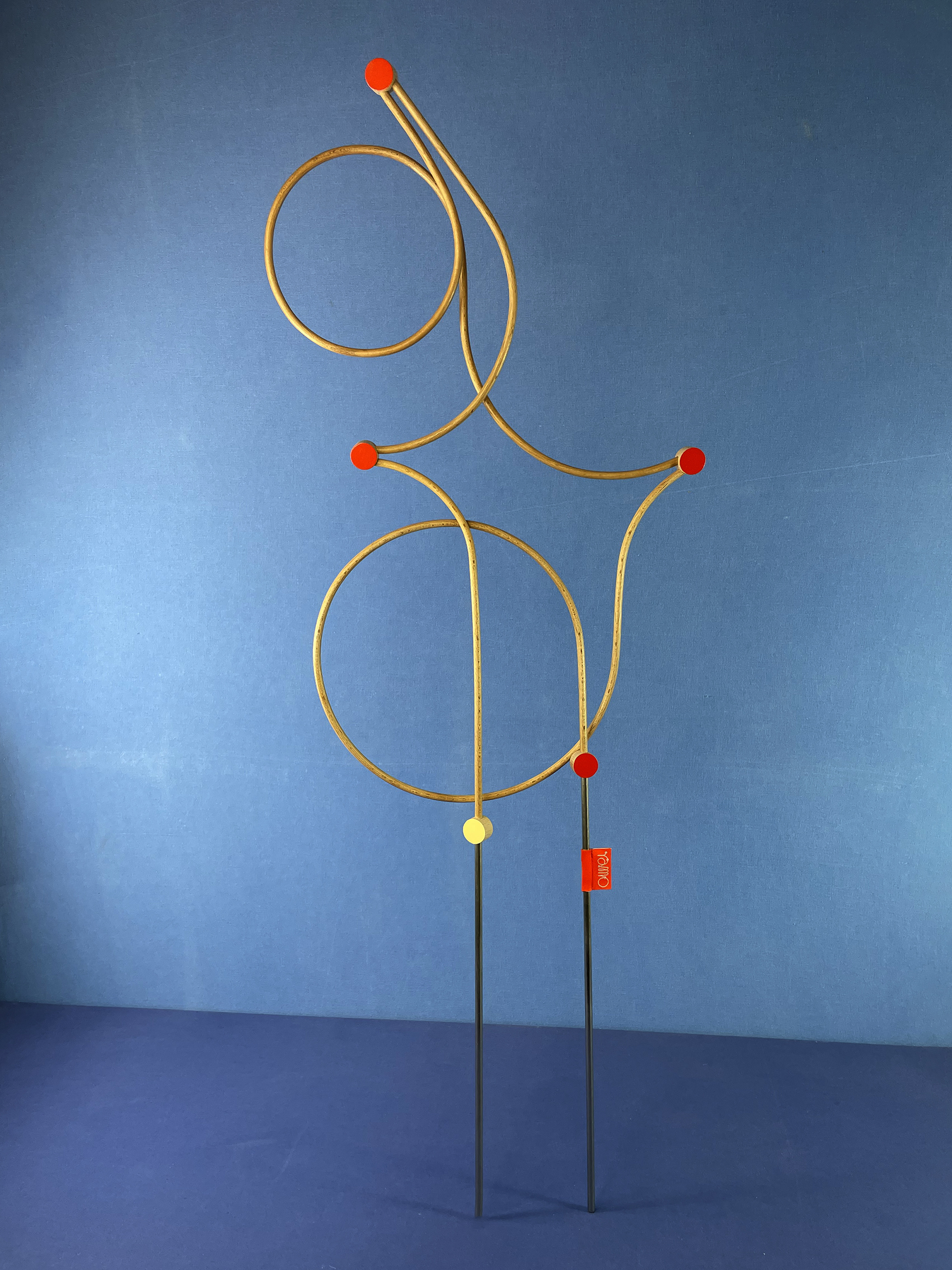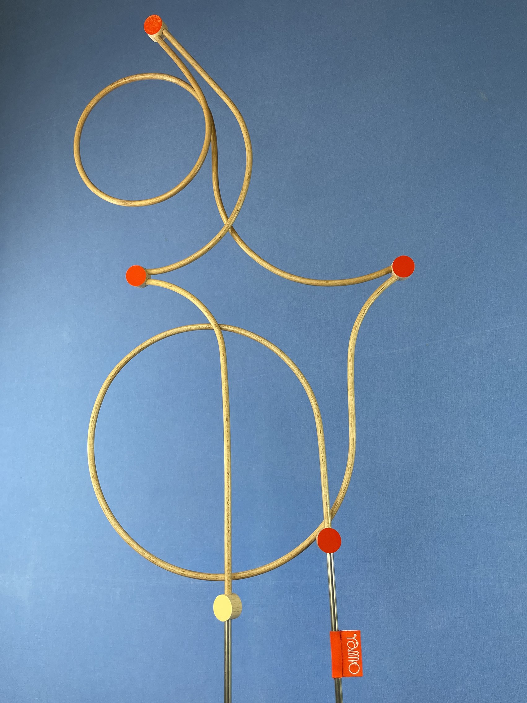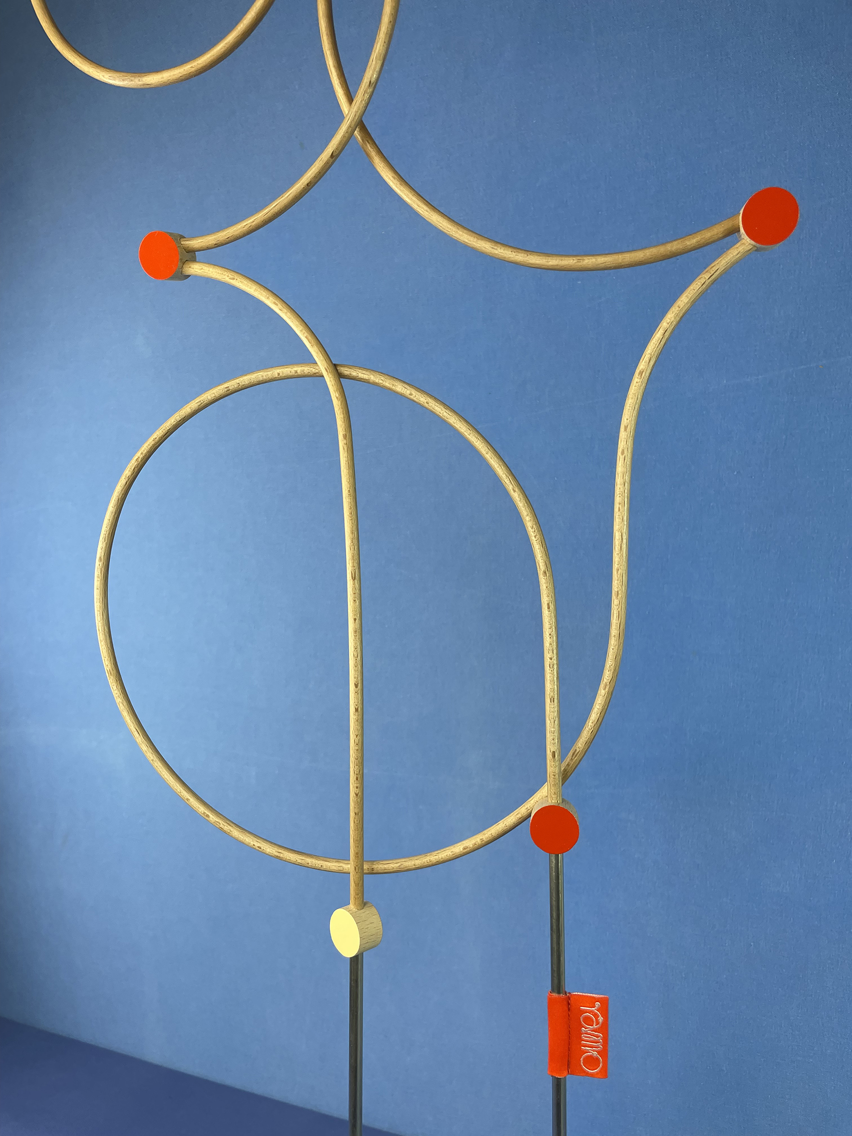 Les connecteurs : Il s’agit des pièces qui relient les tiges. Tout comme ces dernières, ils ont été fabriqués par mes soins (découpés, percés, poncés, vernis et peints), ce qui leur donne quelques irrégularités. Chaque face présente une couleur différente : vermillon et crème.
