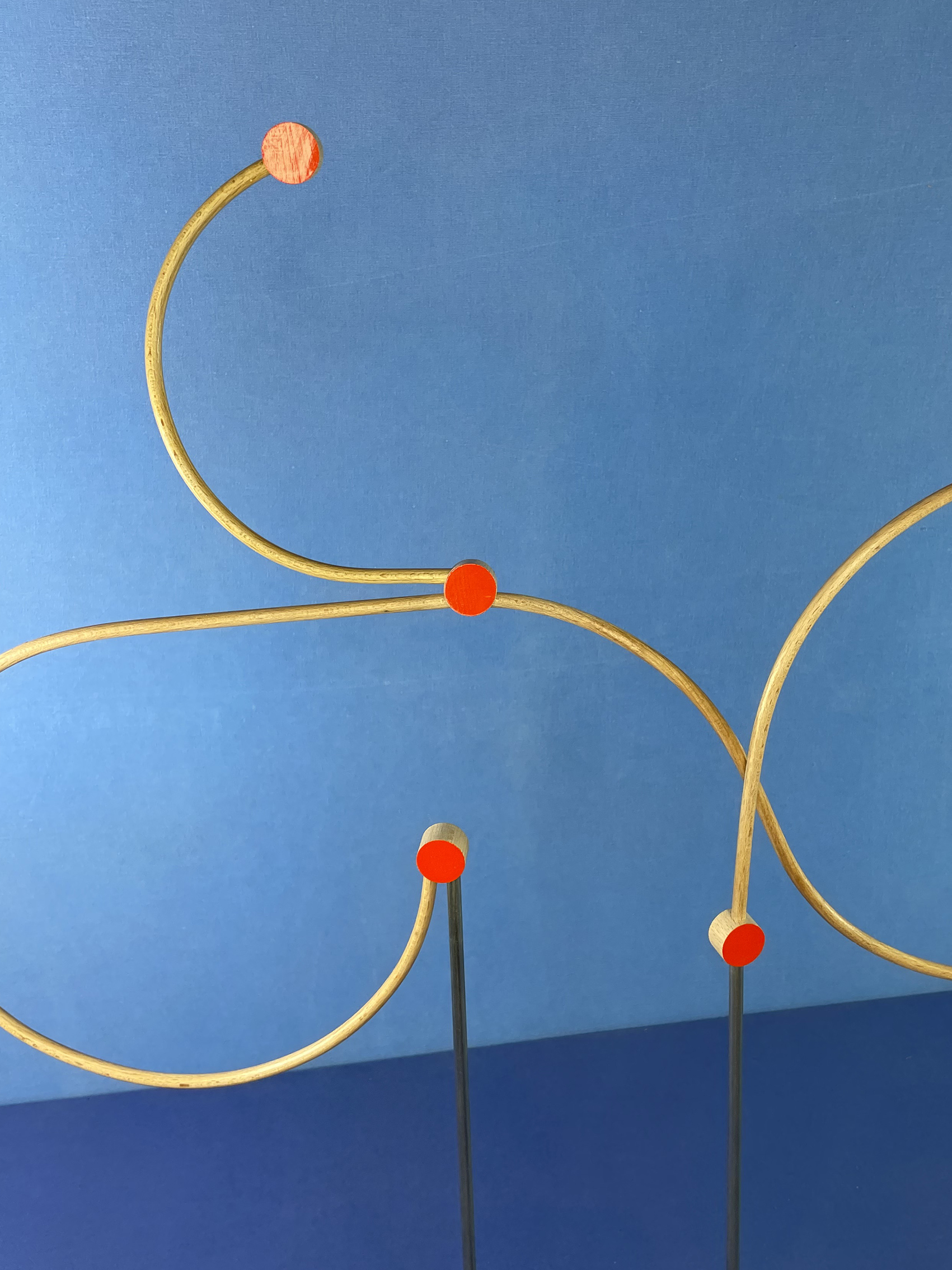 Les connecteurs : Il s’agit des pièces qui relient les tiges. Tout comme ces dernières, ils ont été fabriqués par mes soins (découpés, percés, poncés, vernis et peints), ce qui leur donne quelques irrégularités. Chaque face présente une couleur différente : vermillon et crème.