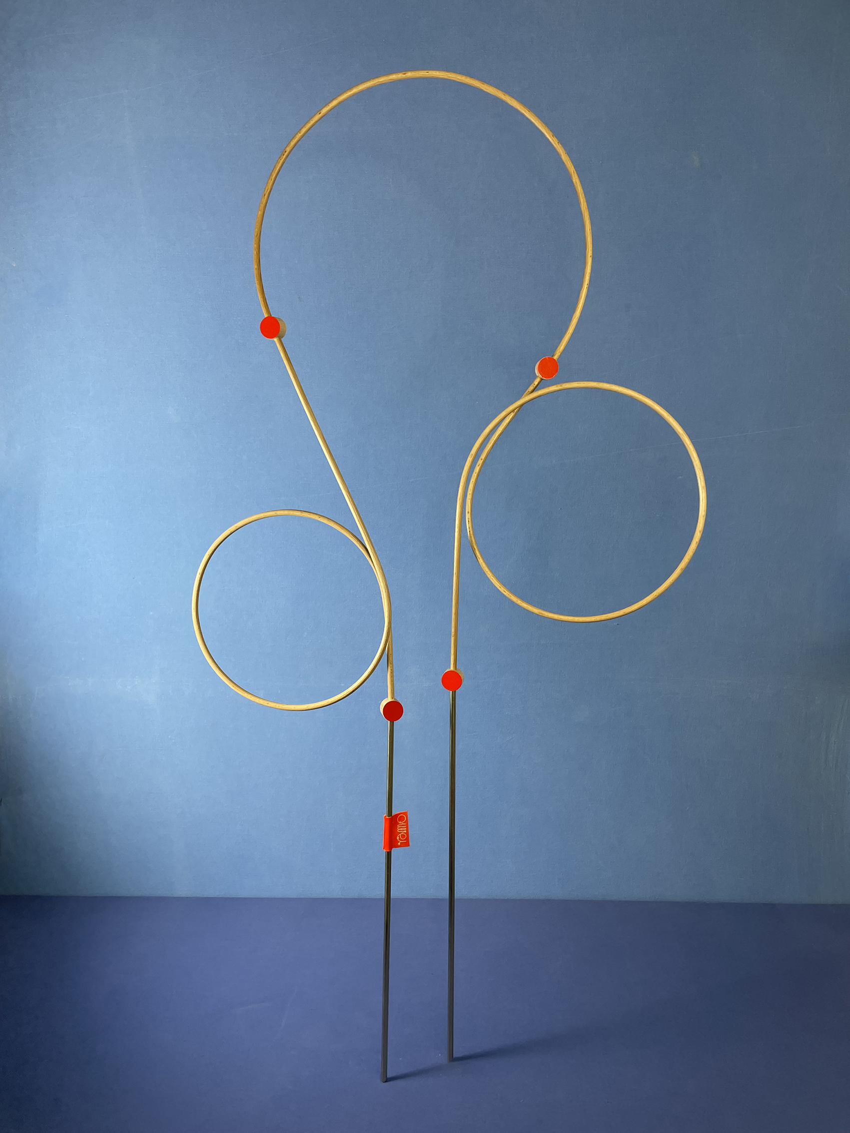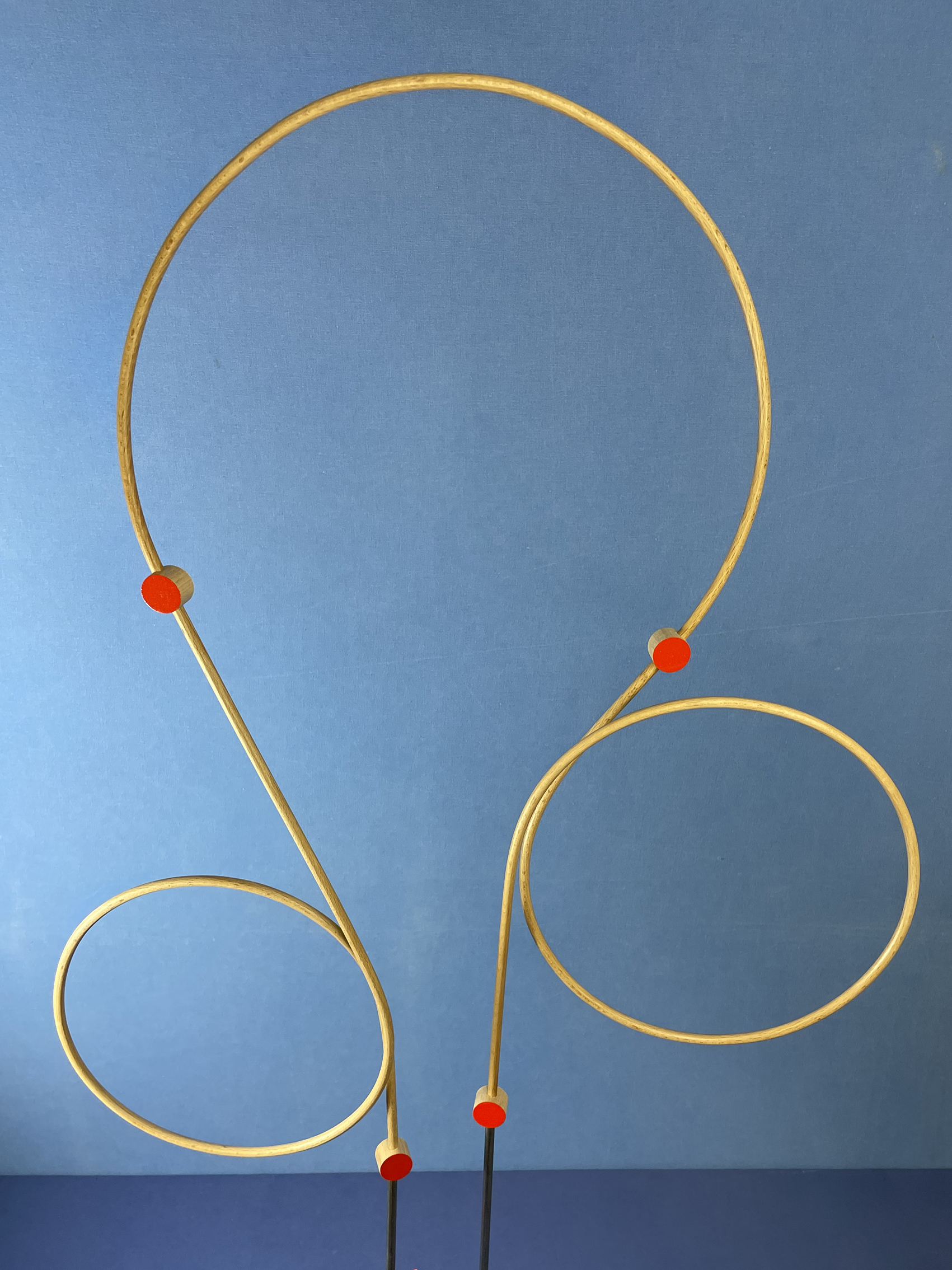 Les connecteurs : Il s’agit des pièces qui relient les tiges. Tout comme ces dernières, ils ont été fabriqués par mes soins (découpés, percés, poncés, vernis et peints), ce qui leur donne quelques irrégularités. Chaque face présente une couleur différente : vermillon et crème.