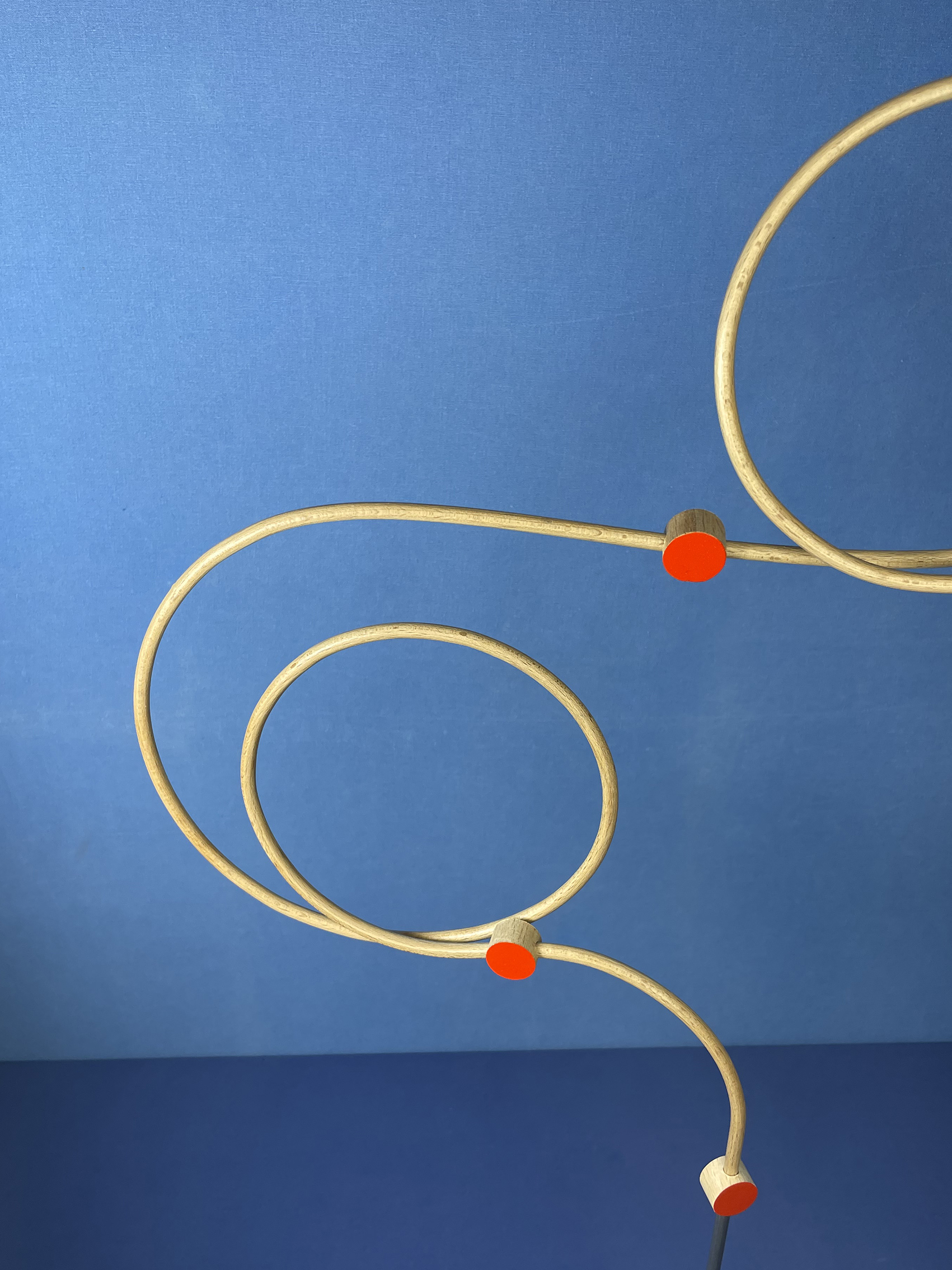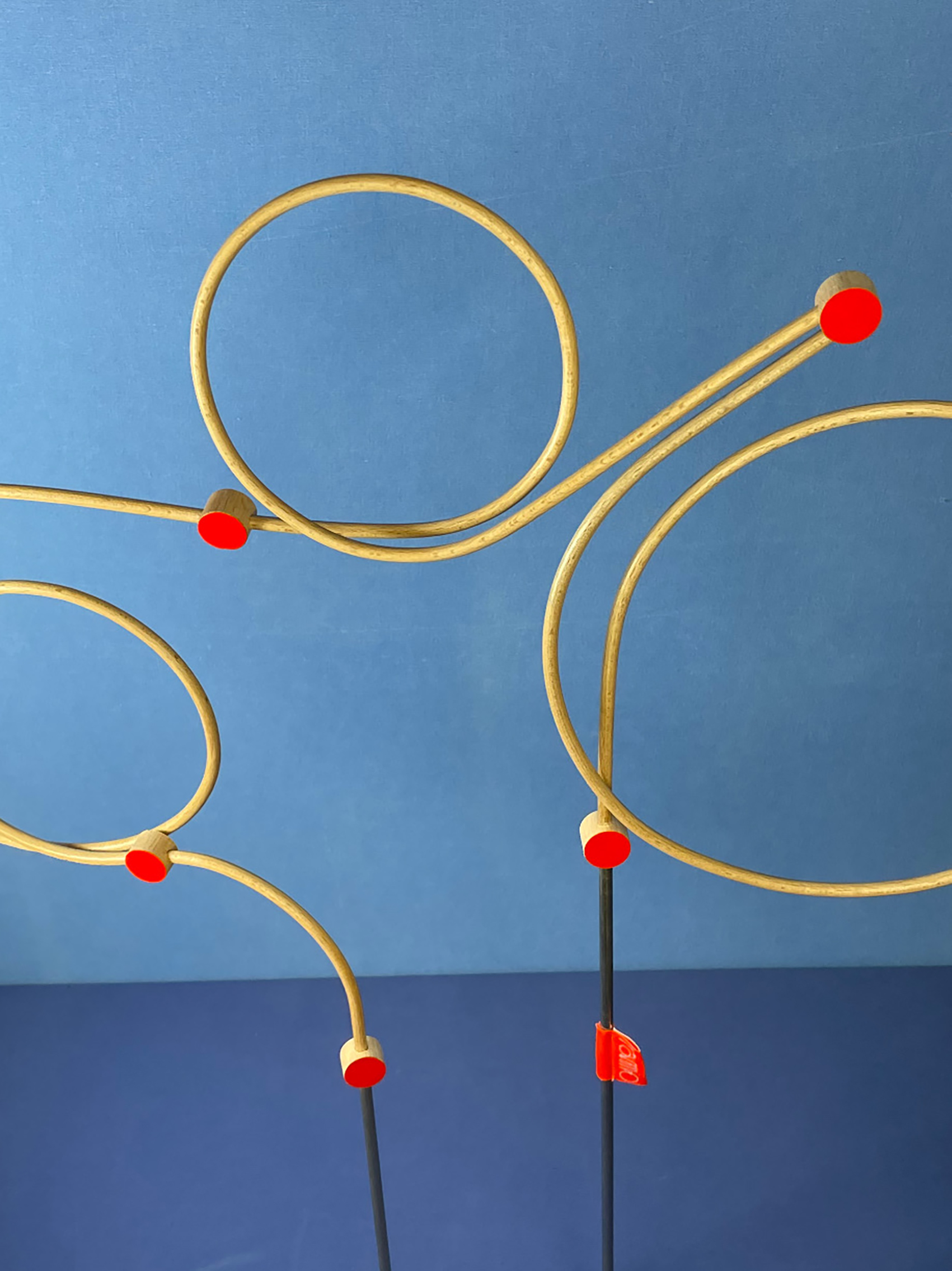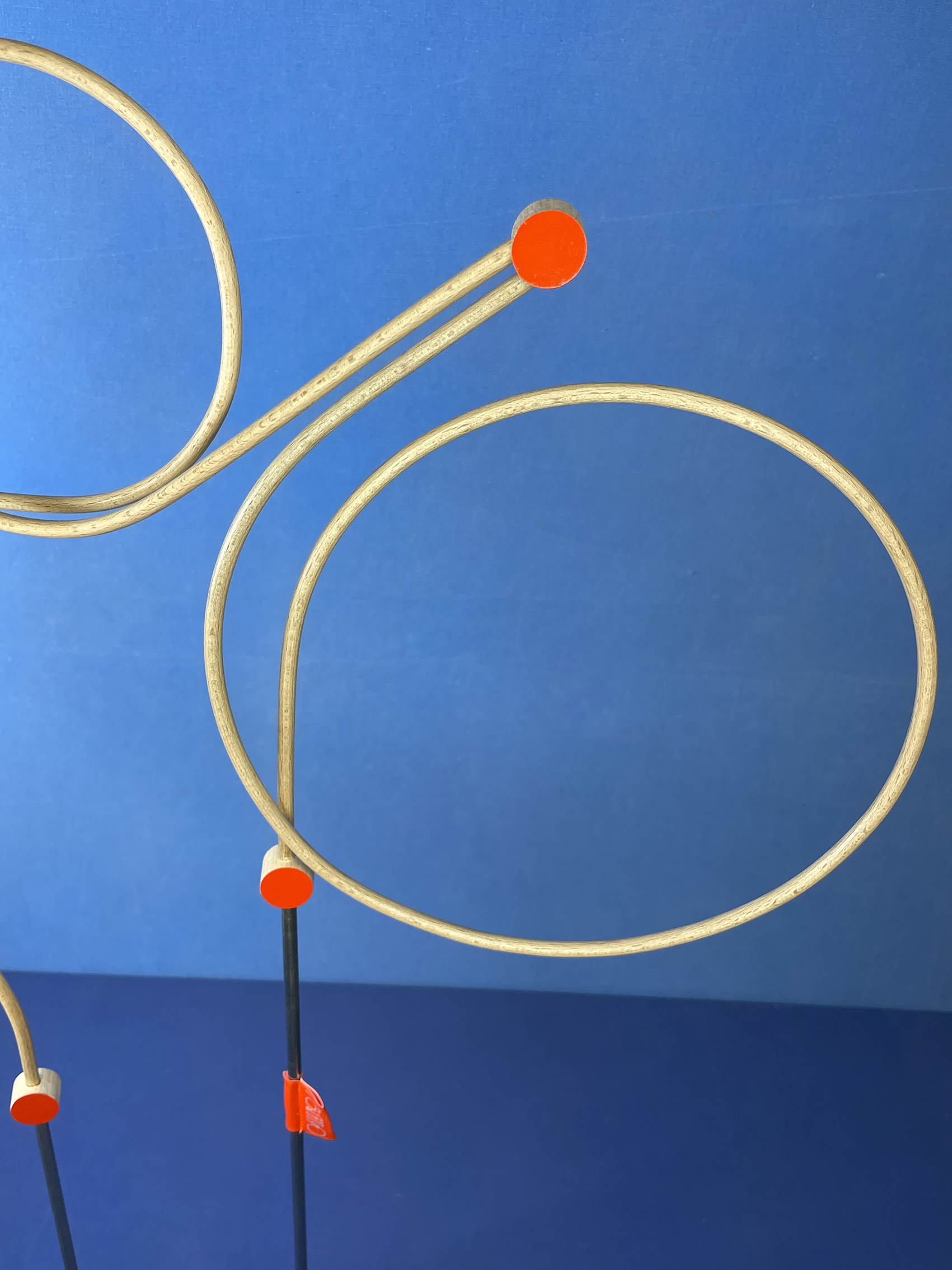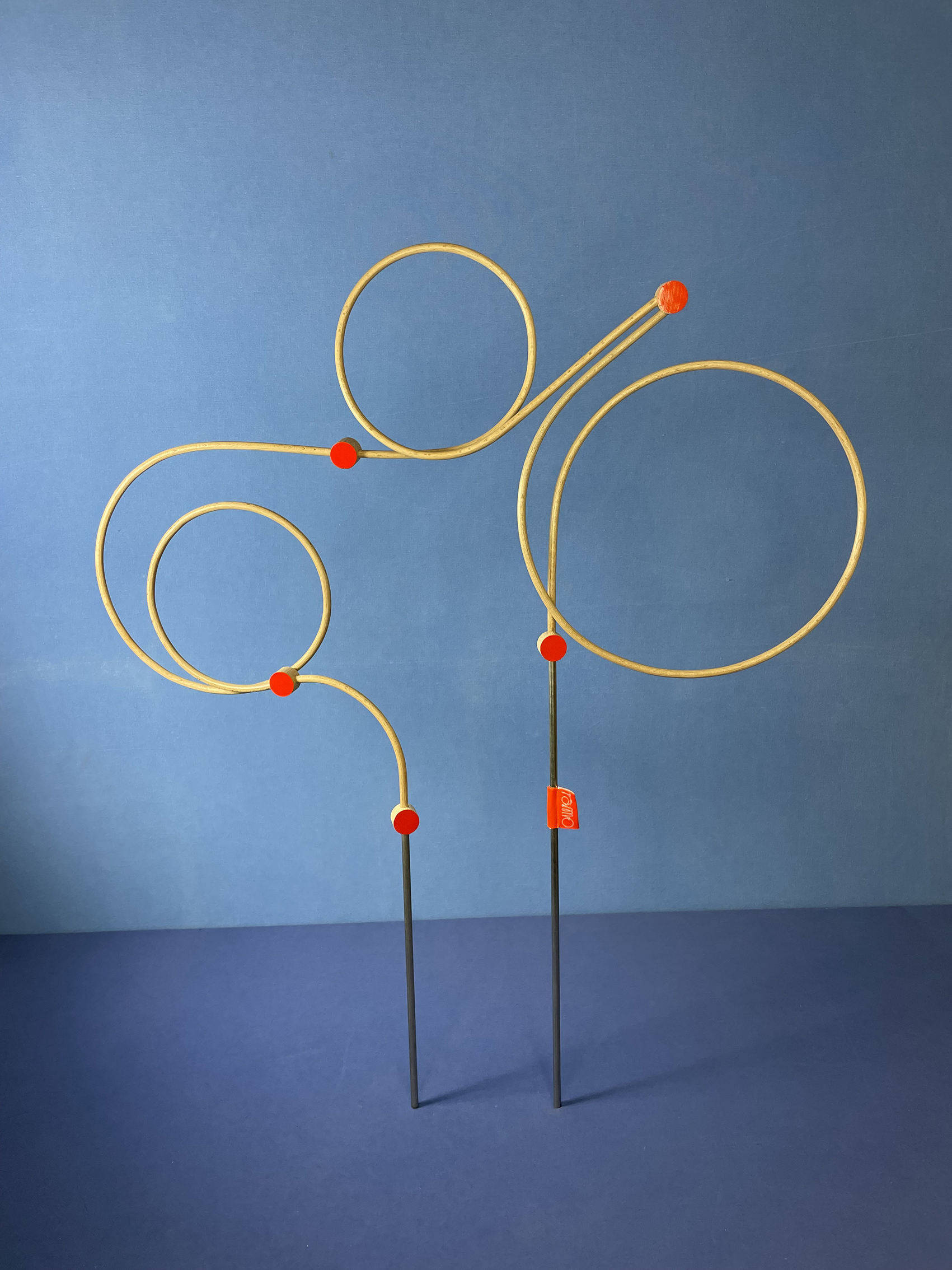 Les connecteurs : Il s’agit des pièces qui relient les tiges. Tout comme ces dernières, ils ont été fabriqués par mes soins (découpés, percés, poncés, vernis et peints), ce qui leur donne quelques irrégularités. Chaque face présente une couleur différente : vermillon et crème.