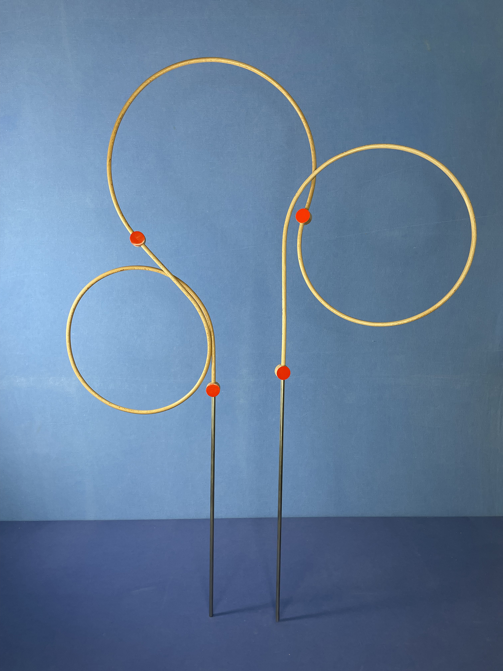 Les connecteurs : Il s’agit des pièces qui relient les tiges. Tout comme ces dernières, ils ont été fabriqués par mes soins (découpés, percés, poncés, vernis et peints), ce qui leur donne quelques irrégularités. Chaque face présente une couleur différente : vermillon et crème.